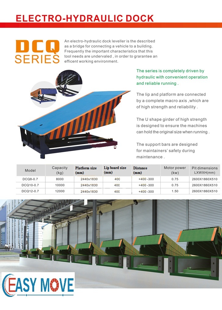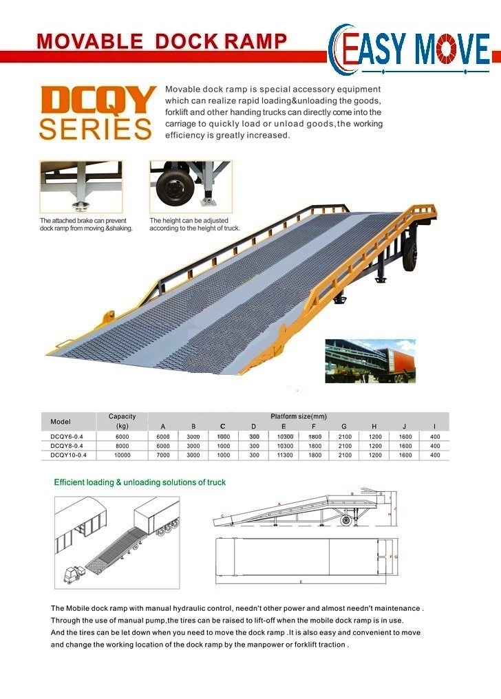 Mobile Dock Ramp movable type hydraulic dock ramp is a special kind of accessory equipment which can realize rapid load and unload of goods. Moreover, its height adjustment function forms a bridge between the truck and the goods table of storeroom. Fork vehicles can drive directly to carriages from ground to carry out batch loading and unloading tasks. It can successfully realize rapid load and unload of goods by a single person. And it can reduce a large number of manpower; geminately improve working efficiency; speed up circulation efficiency of materials; and so asto gain greater economic benefit.