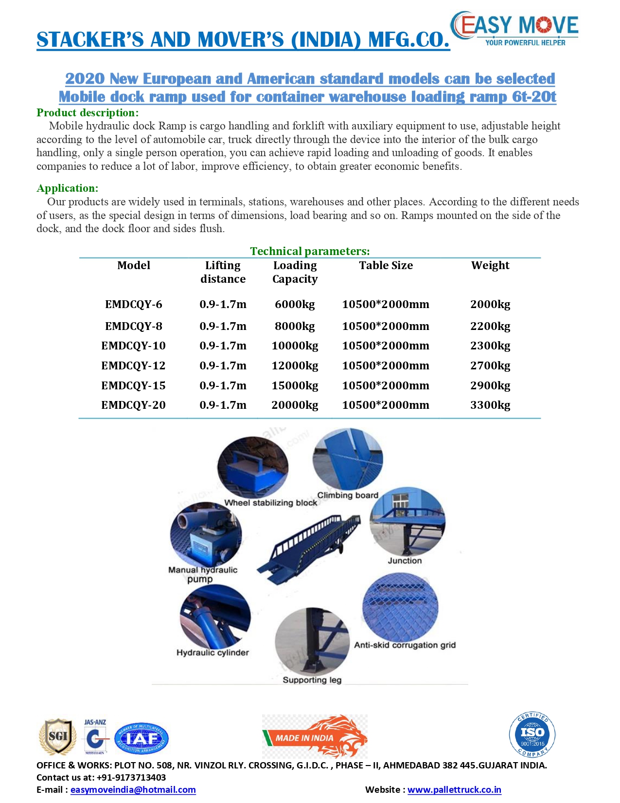 The "EASY MOVE" range of portable Mobile Yard Ramp is the result of the Company''s commitment to its program of continuous product improvement and development. Designed by chase to operate under the most arduous of conditions with ease of maneuverability and operator use. We manufacture the range to exacting quality control standards by us.